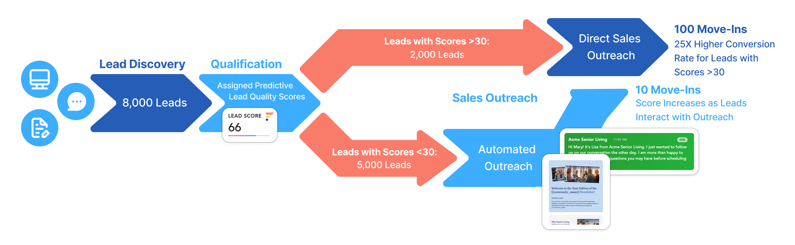 Further’s Move-in Prediction Algorithm—built on the industry’s largest dataset of senior living interactions—takes this a step further. By combining marketing, behavioral, and conversational data, all tied to real move-in outcomes, our machine learning model predicts conversion with over 80% accuracy. This gives sales teams powerful insights into each lead before they ever pick up the phone.
