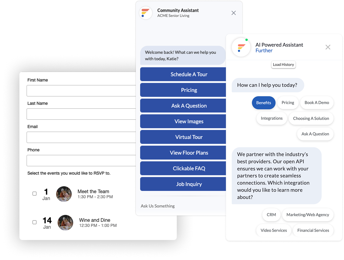 Further is built on the largest dataset of senior living interactions, which means lead capture tools are designed to gather the information that actually predicts intent and readiness—with tools like conversational webforms, care surveys, chatbot experiences, call tracking, and inbound phone support. Instead of collecting surface-level data, you’re collecting decision-making data that fuels better segmentation and better outcomes—targeting the right leads, the right way.