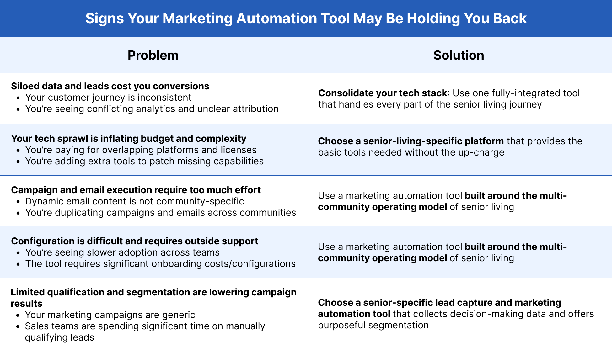 Marketing automation can be a significant advantage—but only if the platform supports the realities of senior living operations. If your current solution is creating fragmented data, increasing manual work, requiring costly support, or limiting your ability to properly qualify leads, it may be preventing you from reaching your full performance potential.