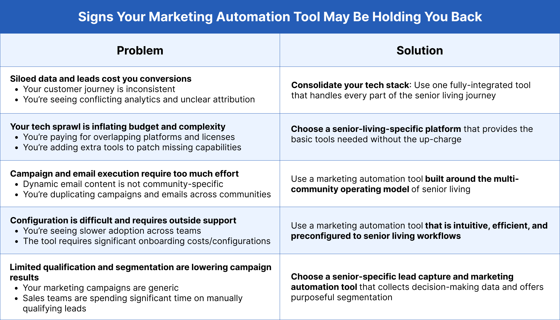 Marketing automation is essential in senior living—but many teams end up assembling a patchwork of tools because their primary platform wasn’t built to support the full senior living journey. When a system can’t handle lead capture, discovery, nurturing, SMS engagement, attribution, and multi-community workflows in one place, operators are forced to buy add-ons and third-party tools to fill the gaps or settle for a limited automation tool. Over time, that often leads to: